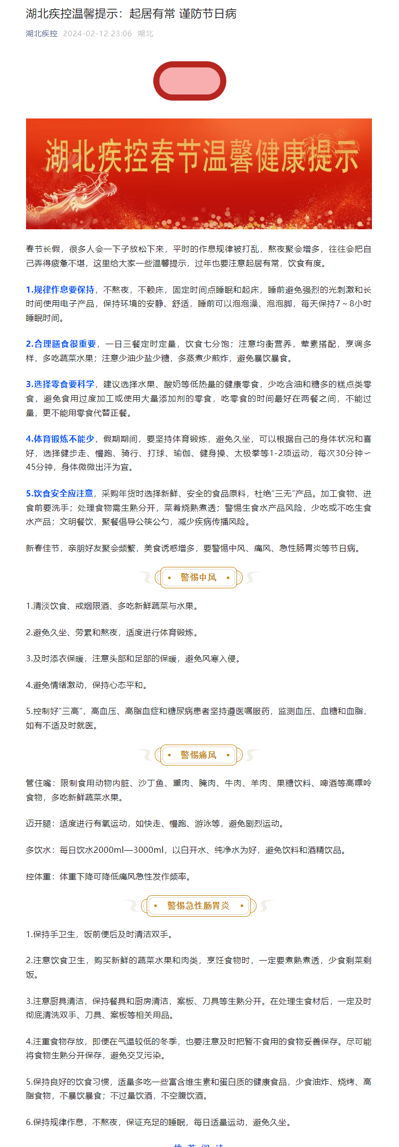 湖北疾控溫馨提示:起居有常 謹防節日病