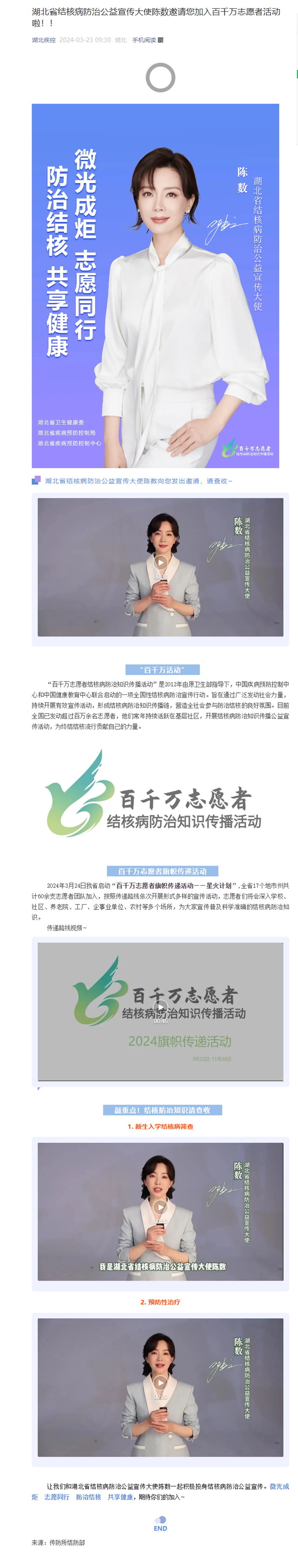 湖北省結核病防治公益宣傳大使陳數邀請您加入百千萬志愿者活動啦??!
