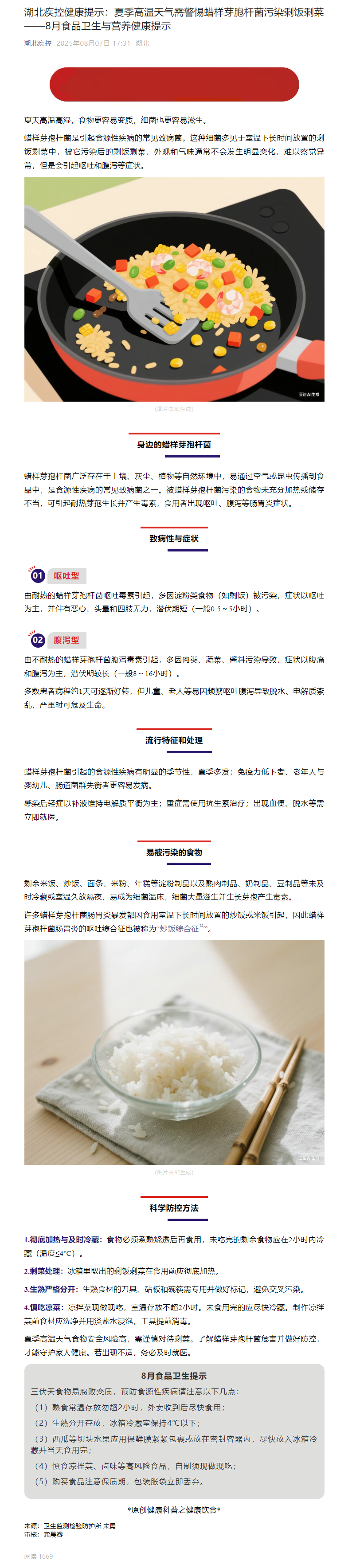 湖北疾控健康提示:夏季高溫天氣需警惕蠟樣芽胞桿菌污染剩飯剩菜——8月食品衛生與營養健康提示