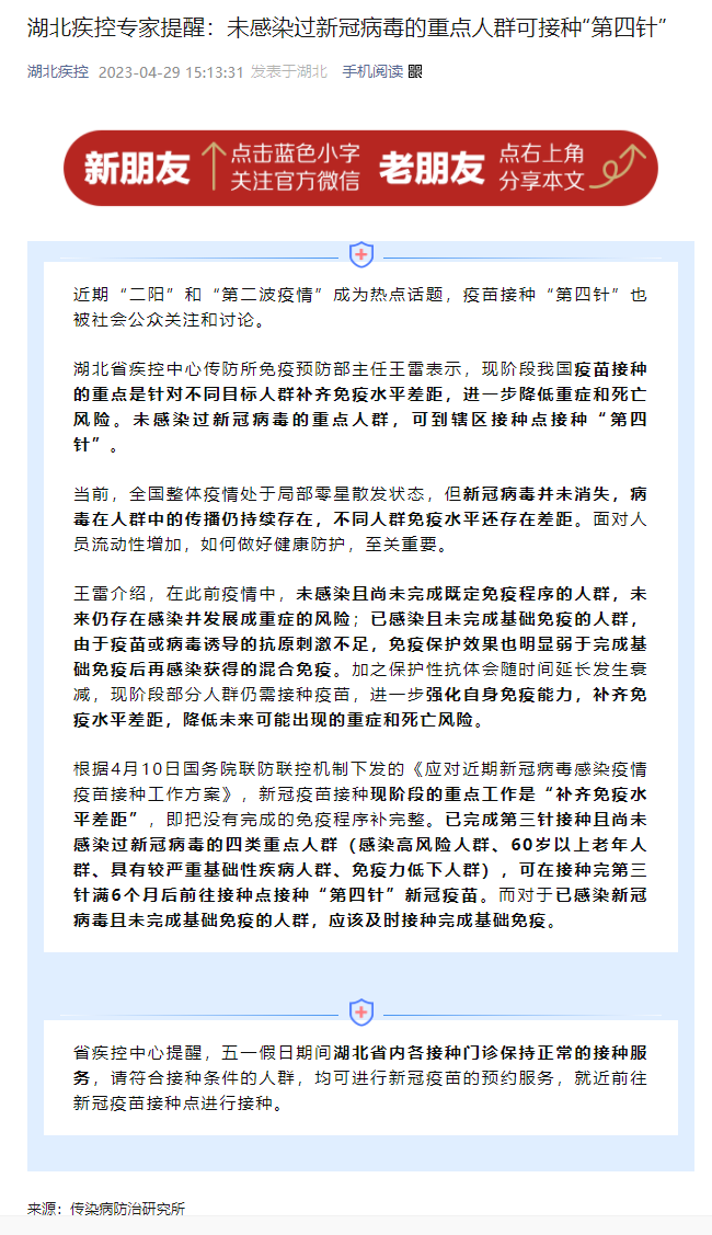 湖北疾控專家提醒:未感染過新冠病毒的重點人群可接種“第四針”