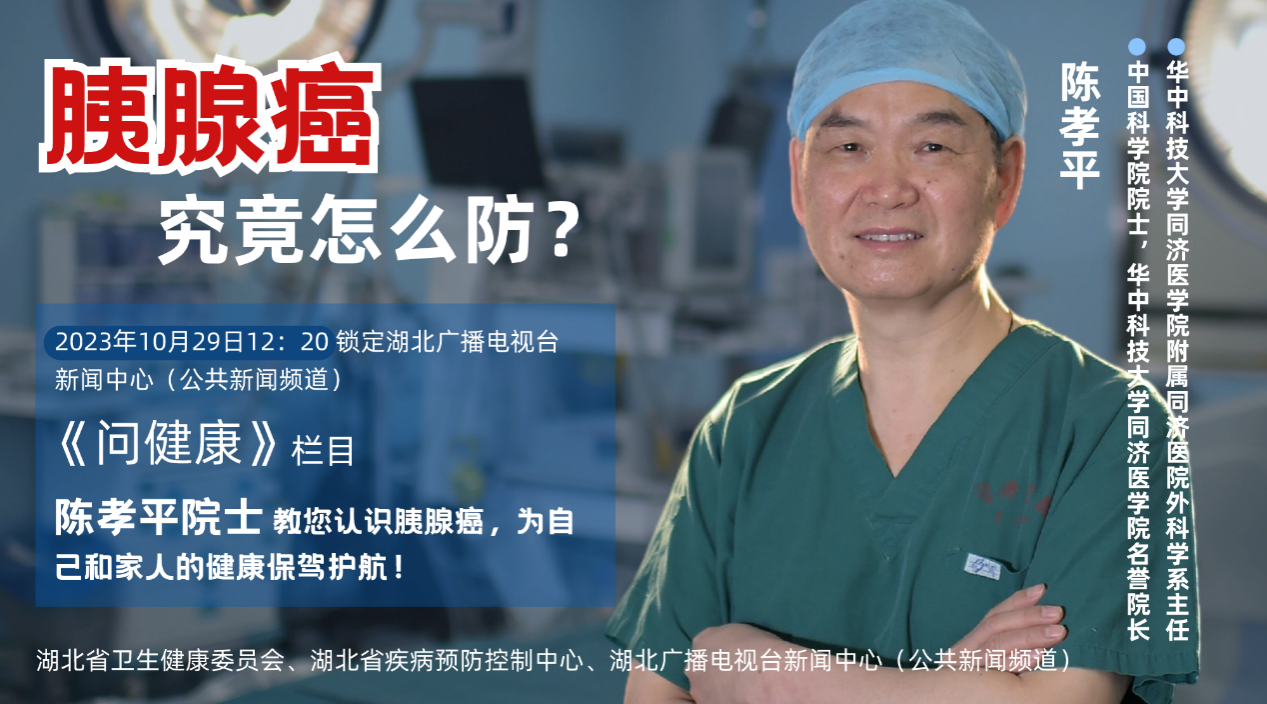 2023年10月8日,在湖北省疾病預防控制中心黨委書記朱洪波陪同下,中國科學院院士、華中科技大學同濟醫學院名譽院長、華中科技大學同濟醫學院附屬同濟醫院外科學系主任陳孝平,來到湖北廣播電視臺新聞中心,出鏡電視科普欄目《問健康》,為觀眾解讀肝癌、胰腺癌防治知識。