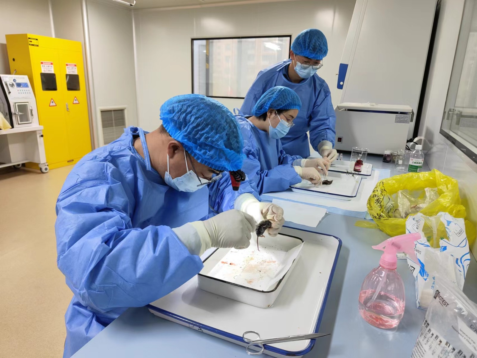 省市縣疾控中心人員綜合了英山縣斑疹傷寒和恙蟲病的報告發病率、地區海拔、地形地貌等因素,選擇了石頭咀鎮、紅山鎮及楊柳灣鎮部分村落作為現場調查點,進行鼠形動物密度調查、體表寄生蟲采集、解剖取樣等工作。鼠形動物密度調查采用夾夜法,通過查看野外的鼠洞、鼠跡,在鼠類出沒的地方以鮮肉為誘餌,布放鼠夾,晚放晨收。捕獲到的鼠形動物首先采集體表鼠蚤和恙螨等寄生蟲,再解剖摘取其肝、腎、肺等樣本,帶回省疾控中心實驗室做進一步的分類鑒定和病原學檢測。此次現場共采集鼠形動物120余只,大量鼠蚤和恙螨,將在4月完成分類鑒定,并開展恙蟲病東方體、莫氏立克次體、普氏立克次體、漢坦病毒、新型布尼亞病毒等病原體的核酸檢測工作。