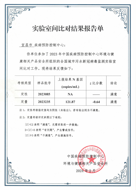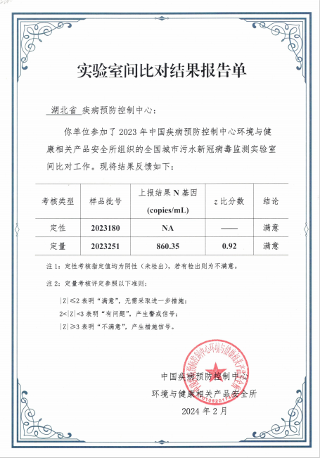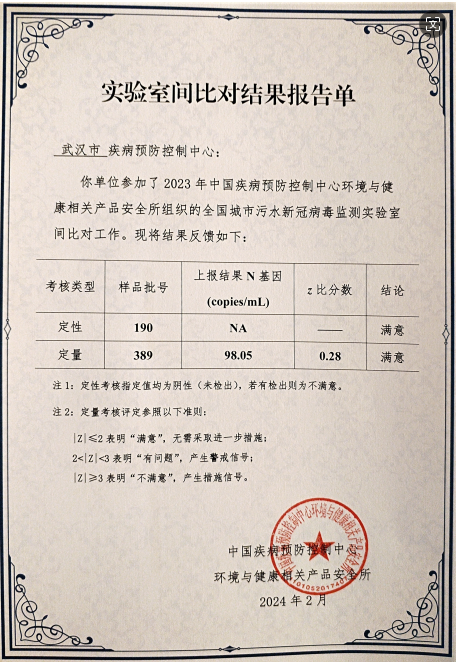 為提高污水新冠病毒監(jiān)測數(shù)據(jù)的準確性和可靠性,受國家疾病預(yù)防控制局委托,中國疾病預(yù)防控制中心環(huán)境與健康相關(guān)產(chǎn)品安全所于2023年底組織開展了城市污水新冠病毒監(jiān)測實驗室間比對工作。本中心和武漢市疾病預(yù)防控制中心、宜昌市疾病預(yù)防控制中心按要求參加了此次實驗室間比對工作。