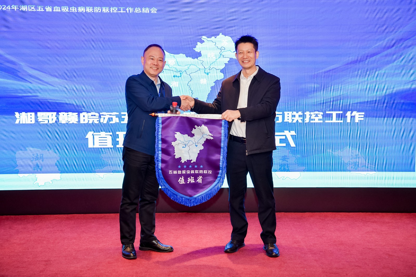 會后,湖南省與湖北省進行了值班省交接儀式。湖北省疾控局副局長趙宏發做表態講話。指出湖北將在國家疾控局、中疾控的領導下,貫徹落實全國疾控工作會議精神和聯防協議框架的要求,進一步深化五省間的合作機制,強化信息共享、技術交流、資源互補,確保聯防聯控工作無縫對接,確保各項防控措施精準高效,保質保量完成2025年值班省各項工作,保障全國血防規劃目標如期實現。
