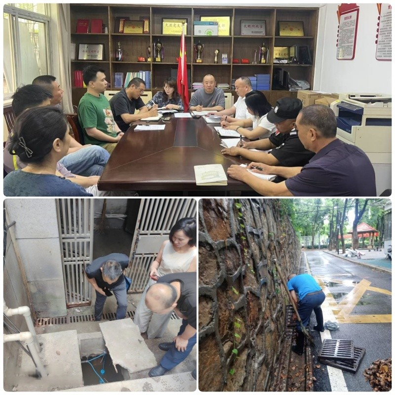 面對(duì)雨情考驗(yàn),總務(wù)后勤處與物業(yè)團(tuán)隊(duì)展現(xiàn)高效應(yīng)對(duì)。在屋頂平臺(tái),工作人員頂風(fēng)冒雨排查積水,憑借豐富經(jīng)驗(yàn)精準(zhǔn)定位滲漏隱患。排水管道疏通是重點(diǎn)任務(wù),尤其在綠植密集區(qū)域,員工徒手清理堵塞渠口的落葉雜物——有人俯身掏挖障礙,有人直接伸手探入渾濁積水中,確保關(guān)鍵排水路徑暢通無阻。