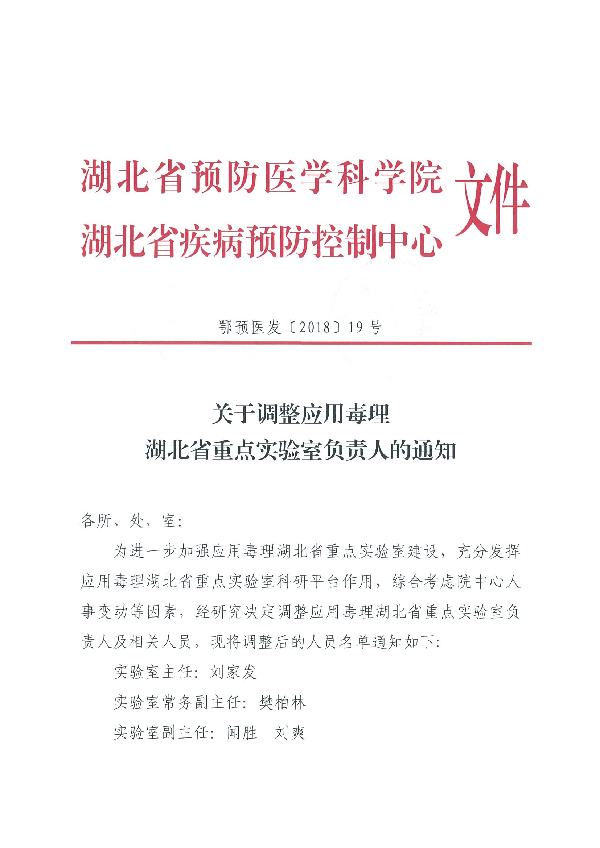 關(guān)于調(diào)整應(yīng)用毒理學(xué)湖北省重點(diǎn)實(shí)驗(yàn)室負(fù)責(zé)人的通知