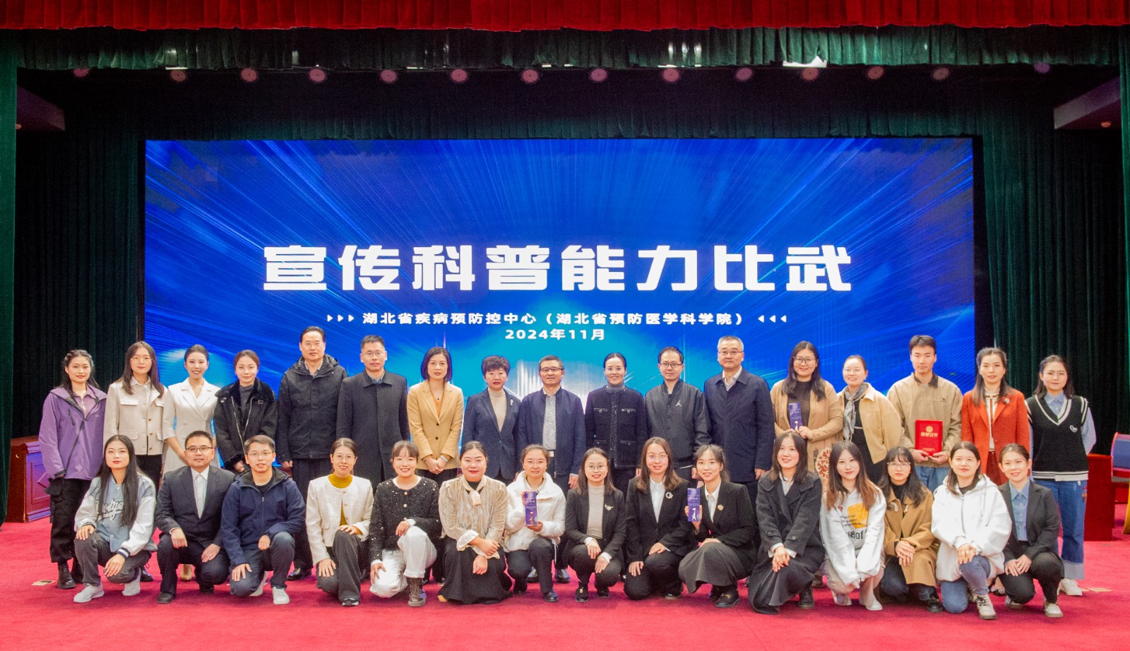 本次比武由湖北省衛(wèi)健委宣傳處處長劉敏、省疾控局綜合處處長明珠、規(guī)財(cái)處處長熊國平、湖北電視臺融媒體中心劉艷利、湖北日報(bào)社龍華擔(dān)任評委,湖北省電視臺記者彭欣瑩擔(dān)任提問嘉賓,中心(院)黨委書記朱洪波、副主任李陽、工會主席袁世坤等領(lǐng)導(dǎo)出席了活動并為獲獎?wù)哳C獎。